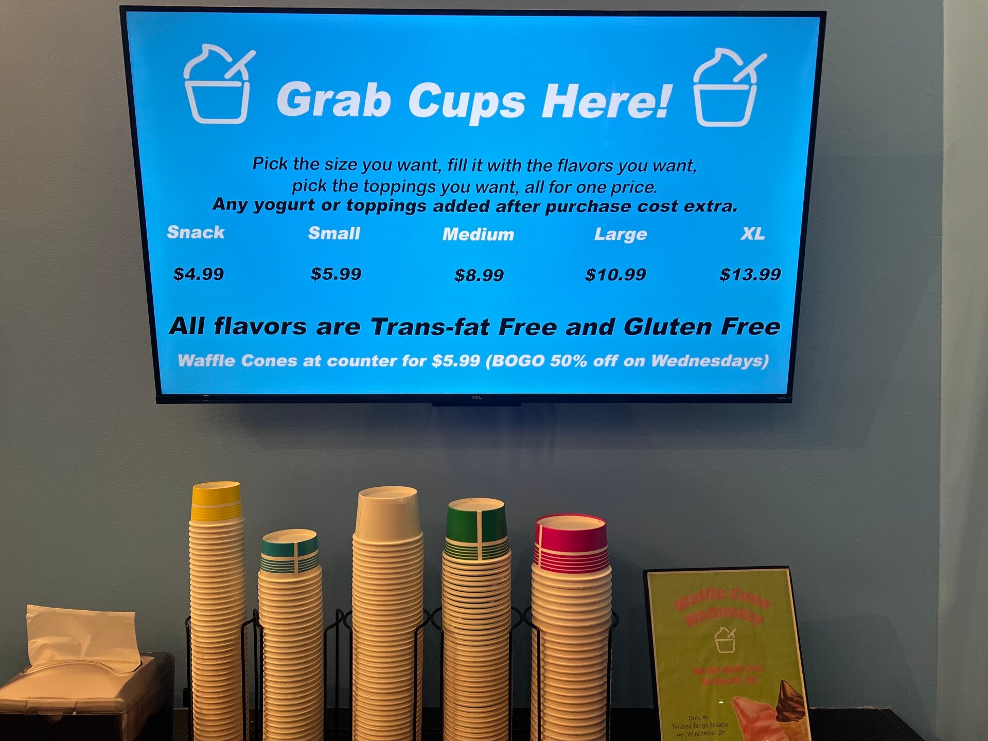 We charge a flat rate. Choose the cup size and price you like and load up as much FroYo and toppings as you want. We do not weigh!